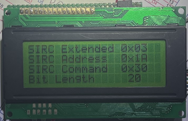 Above is a picture of my code reader. It's got a standard 38kHz IR receiver going into a Microchip PIC16F886 driving HD44780 controller 20x4 LCD display. The board's got a few buttons and LEDs. I wrote all the code in MPASM including the SIRC decoding. It's the same code I use in my wireless tape deck remote adapters.