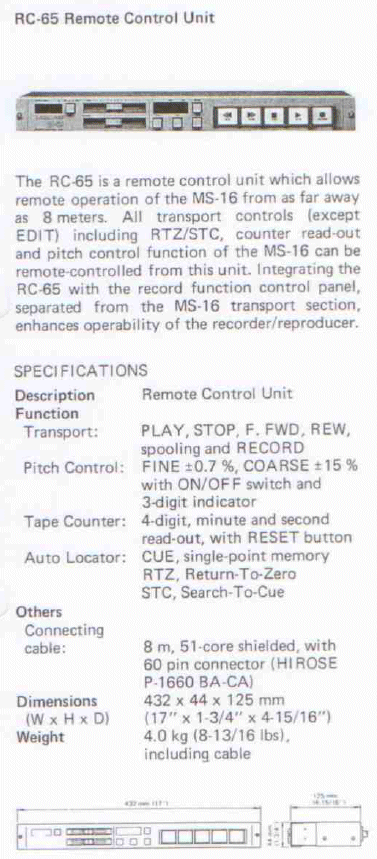 Tascam RC-65 - Remote for the Tascam MS-16 1", 16-channel Reel to Reel deck