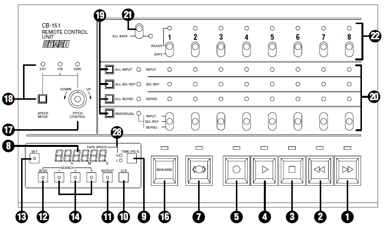 CB-111 Remote Control Box with pitch control knob, cue and search zero buttons as well as Record, Play, Stop, Rewind and F.Fwd. Plugs into the Auto Locator connector on the back of the MTR-10 and others.